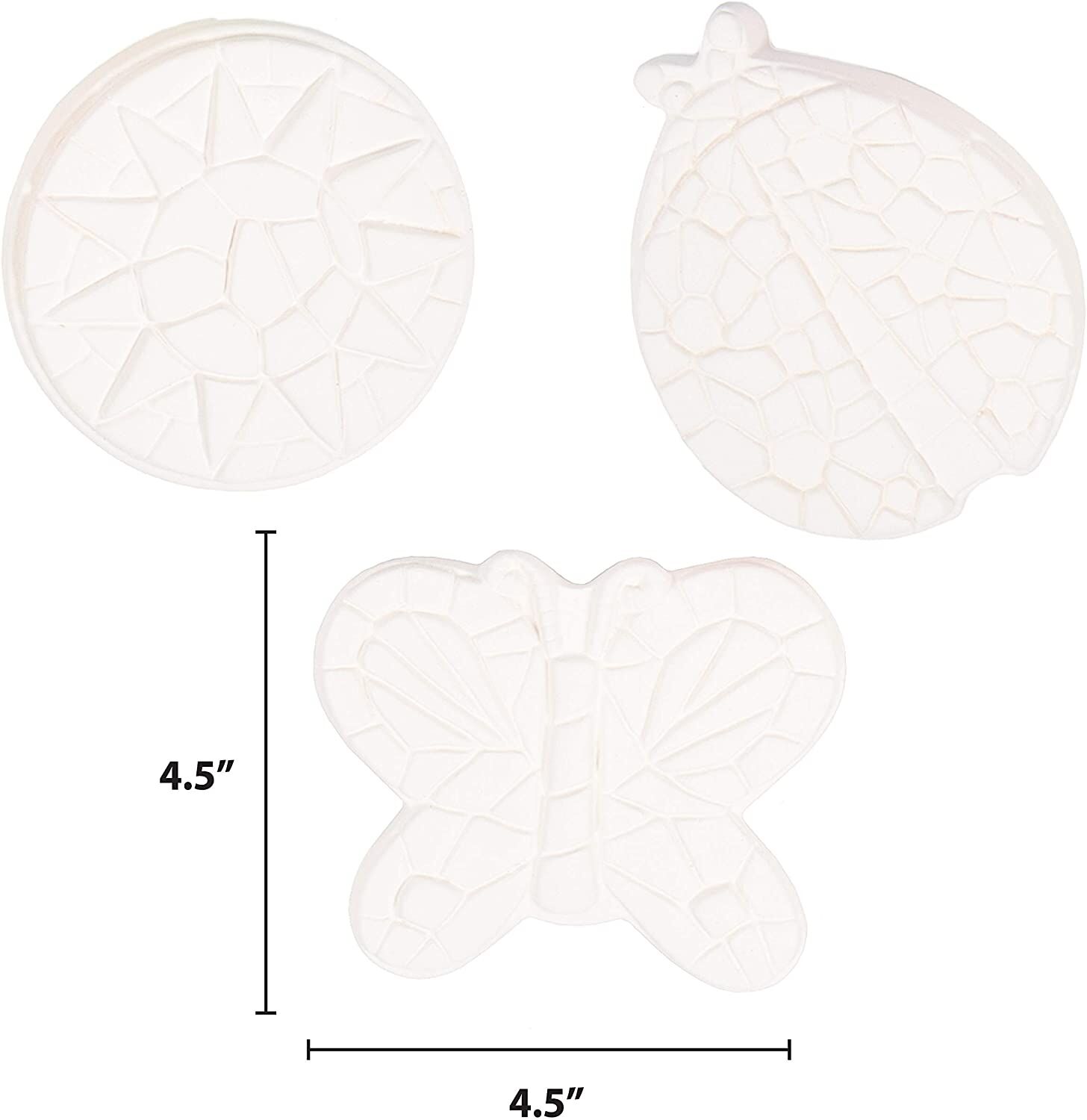 Includes three pre-cast stepping stones shaped as a butterfly, ladybug, and sun, ready to paint and personalize .