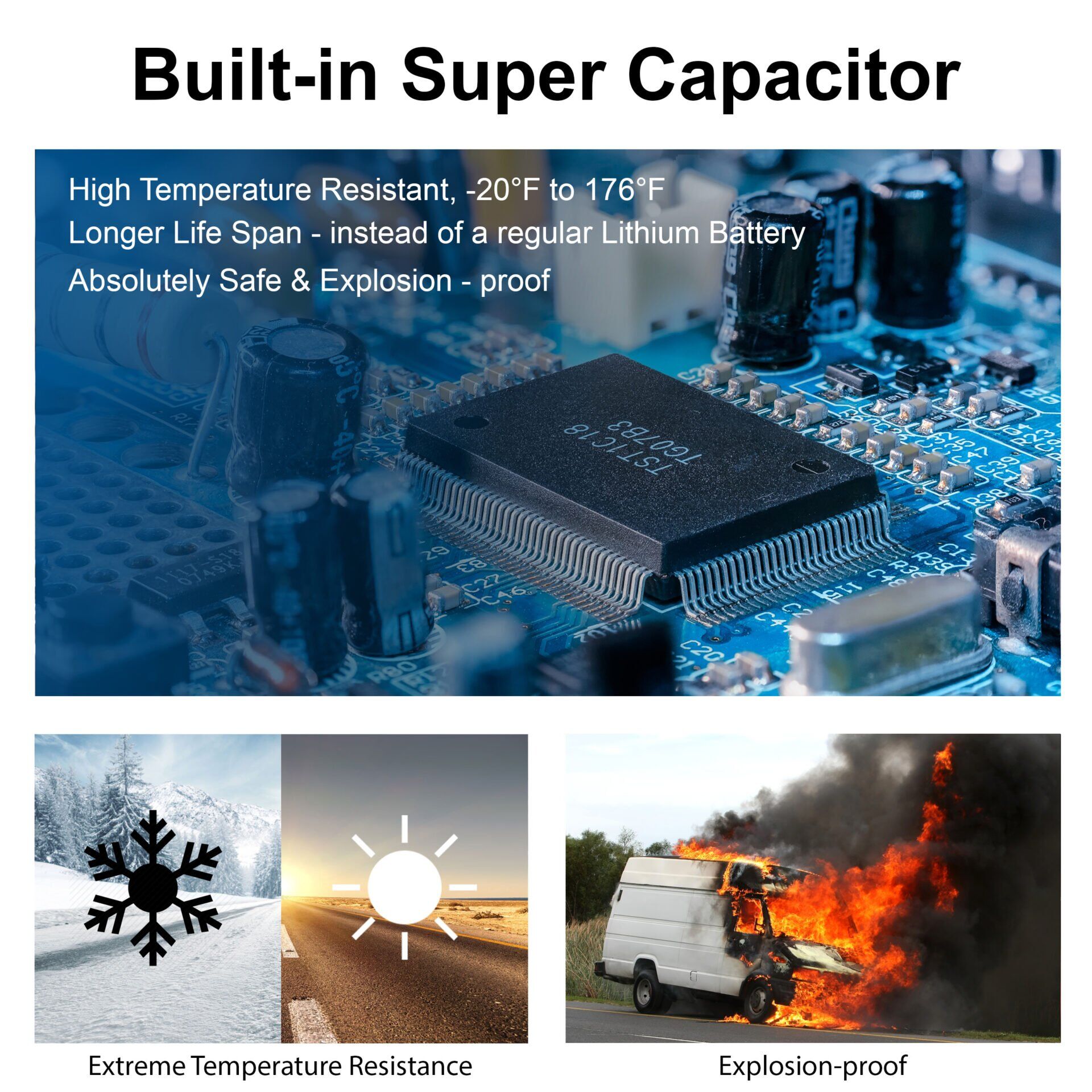 Powered by a durable supercapacitor—more reliable than standard lithium-ion batteries, especially in extreme temperatures. The parking monitor automatically records when motion or vibration is detected, or captures continuous footage using time-lapse mode (requires a hardwire kit, sold separately). - Loop Recording & G-Sensor Emergency Lock
