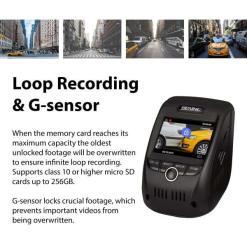 - LOOP RECORDING – Recordings are split into segments. When the storage limit is reached on the memory card, new recordings will automatically overwrite the oldest recordings. Supports class 10 or higher micro SD cards up to 256GB in size (not included).