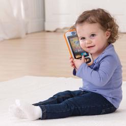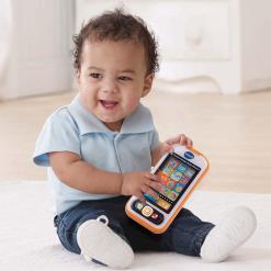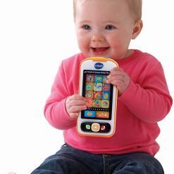 Vivid colors and a touch screen engage your child as they role-play by calling family, friends or even their stuffed animals. The “Home” button feature allows you to record and save your home number for learning. With a pretend calendar, clock and weather apps, your baby learns about the day while the touch screen and slider build hand/eye coordination.